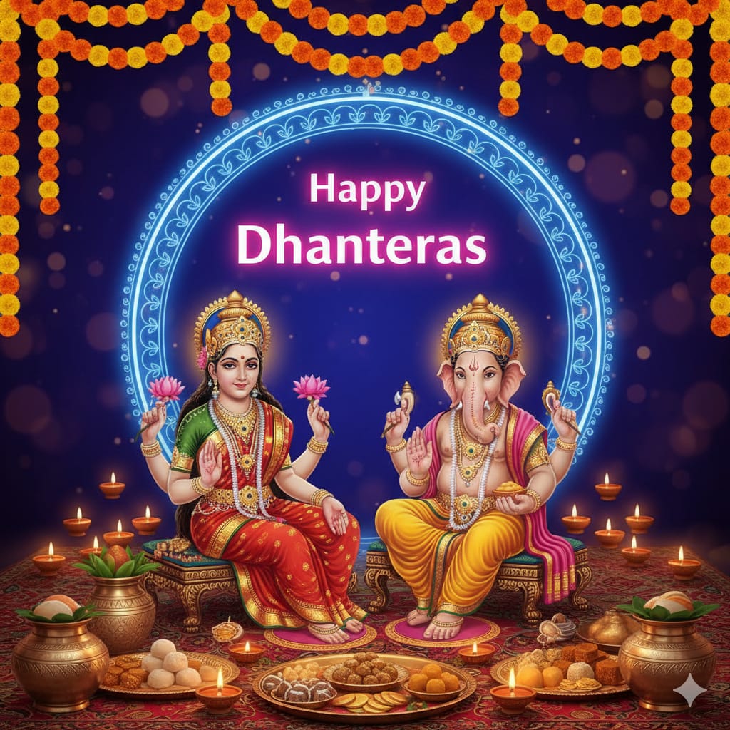 A god Devine like Laxmi and Ganesh sitting both together and Diya (oil lamp) is light in sourding and Dhanteras celebration setup with a central “Happy Dhanteras” message in bold pink text surrounded by an ornate, colorful circular frame. Traditional pots and items like sweets and coins are arranged in the foreground. Yellow marigold garlands hang above, and the background features a gradient of blue and purple, enhancing the festive ambiance.