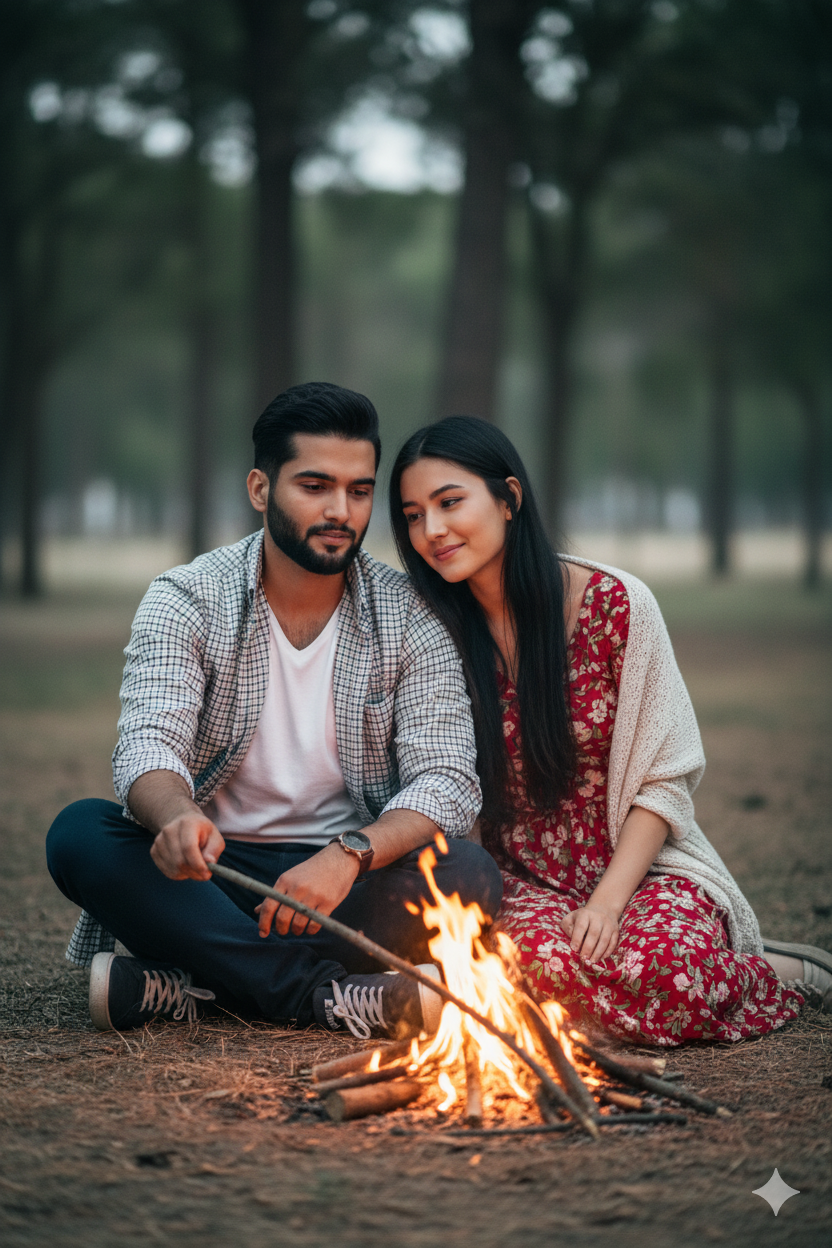 Pose & Expression: The man is gently holding a stick near the fire while looking at it with a calm, focused expression. The girl sits close beside him, slightly leaning towards him, looking at him with a soft affectionate smile. Their expressions exactly match the reference – natural, relaxed, romantic. Camera Setup: full frame, full body visible, no crop, balanced cinematic framing.