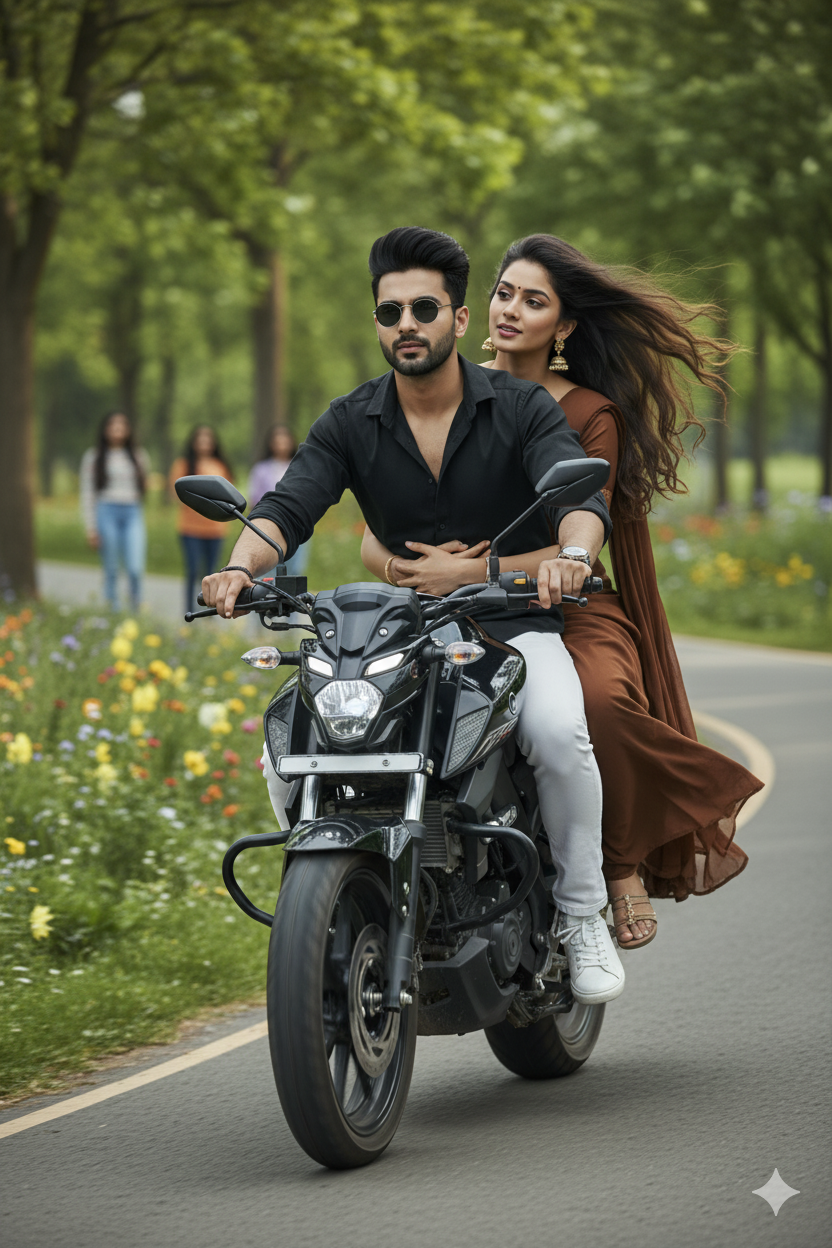 Create a realistic 4K cinematic close-up front shot of a young slim-fit couple riding a sleek black Yamaha MT-15 at high speed on a lush green park pathway. Both faces are perfectly clear and sharp, same face reference image. The boy wears a black shirt, white jeans, white white sneaker, and round black sunglasses, gripping the handlebars confidently. The beautiful girl in a flowing brown saree with brown blouse and wearing golden jhumka (earing) holds him tightly with both hands, her long hair flying in the wind. The glossy white TVS Appache bike shows precise detail with subtle motion blur. Background: lush greenery, colorful wildflowers, and a few girls standing at a distance watching them. Natural cinematic lighting adds speed, drama, and intensity to the shot.”